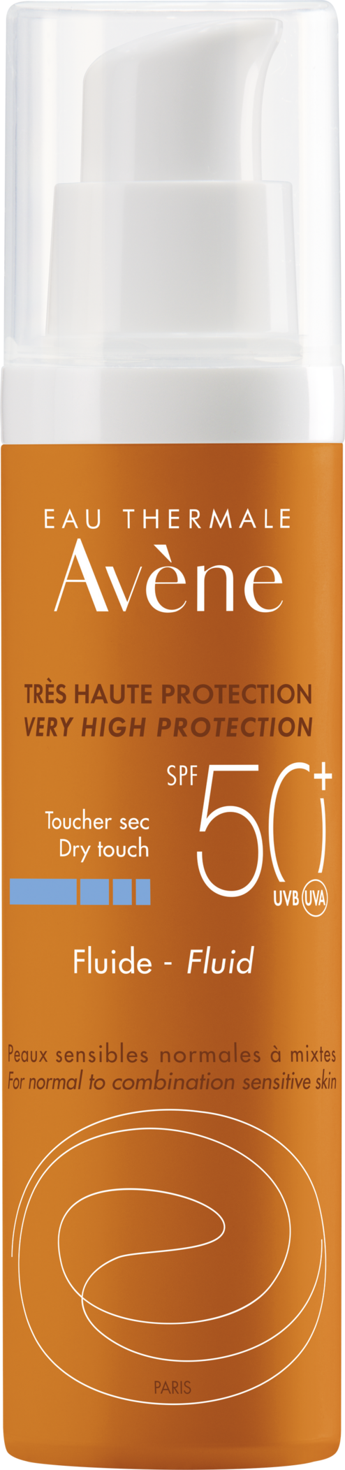 Le Fluide SPF 50+ offre une très haute protection solaire à la peau sensible normale à mixte, exposée à un ensoleillement intense et/ou toujours sujette aux coups de soleil. Sa texture légère, Sensation peau nue, laisse un fini sec et non brillant, imperceptible sur la peau.